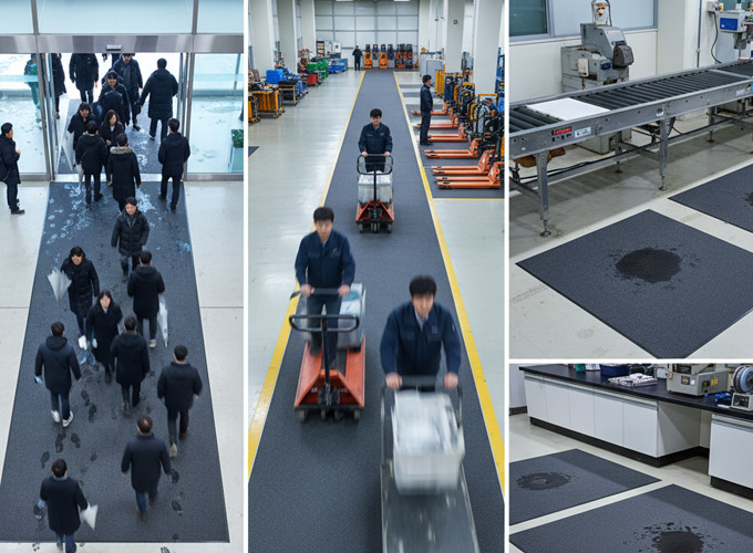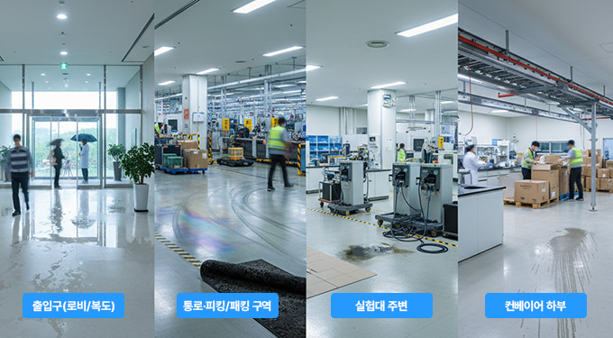 매트 문제라고 하면 보통 출입구를 먼저 떠올리지만, 실제로 미끄러짐·말림·재배치가 반복되는 곳은 훨씬 넓습니다. 로비·복도·라인 사이 통로·피킹/패킹/충전 구역·실험대 주변·컨베이어 하부 즉, 전 구역이 핵심이에요.