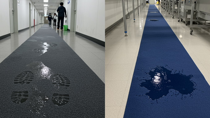 - 보행 동선에는 일반 접착식 플로어 매트를, 드립 포인트에는 접착식 흡착제 매트를 적용합니다.