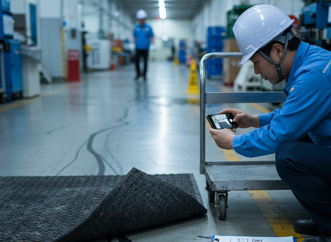 바퀴 동선(피킹/패킹/충전): 저프로파일 + 접착 고정이라 카트/핸드트럭이 속도를 잃지 않고 통과합니다. “들뜬 가장자리를 펴느라 멈추는 시간”이 사라지는 거죠.