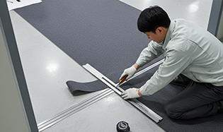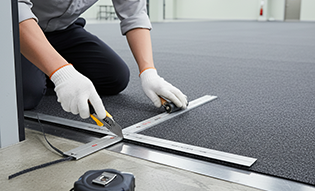 3. 트리밍: 문턱, 코너, 경사로에 맞춰 현장 치수를 정확히 재단해 들뜨거나 말리는 현상을 예방합니다. |
