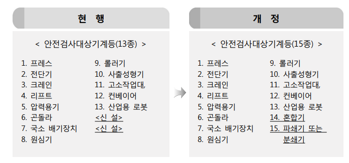 - 혼합기, 파쇄기, 분쇄기가 안전검사 대상 기계·기구로 정식 추가
