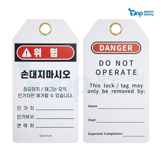 한글과 영문이 인쇄된 꼬리표 형태로, 작업 중지나 위험 경고를 표시합니다. 태그아웃(Tagout) 용도로 설계됨. |