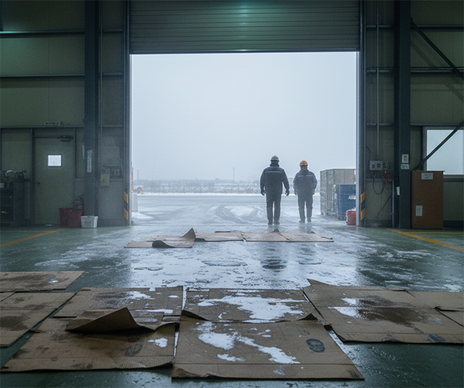 겨울철 현장에서 가장 흔한 대응은 젖은 바닥 위에 박스·골판지·천을 놓는 방식입니다. 하지만 조사·감독에서는 이 장면이 이렇게 해석됩니다.